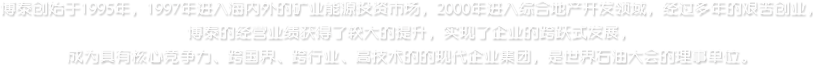 博泰創始于1995年,1997年進入海內外的礦業能源投資市場,2000年進入綜合地產開發領域,經過多年的艱苦創業,博泰的經營業績獲得了較大的提升,實現了企業的跨躍式發展,成為具有核心競爭力、跨國界、跨行業、高技術的的現代企業集團,是世界石油大會的理事單位。